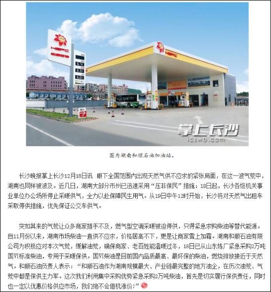 近幾日,湖南部分市州已迅速采取“壓非保民”措施,停止了眾多商家及出租車的燃?xì)夤?yīng)。突如其來(lái)的氣荒讓大家措手不及。為了確保市場(chǎng)供油穩(wěn)定,讓星城人民溫暖過(guò)冬,順暢出行,和順石油積極應(yīng)對(duì),從山東緊急采購(gòu)2萬(wàn)噸國(guó)VI標(biāo)準(zhǔn)柴油,專門(mén)用于市場(chǎng)保供,切實(shí)履行企業(yè)社會(huì)責(zé)任,同時(shí)以優(yōu)惠價(jià)格供應(yīng)市場(chǎng),絕不借機(jī)漲價(jià)。